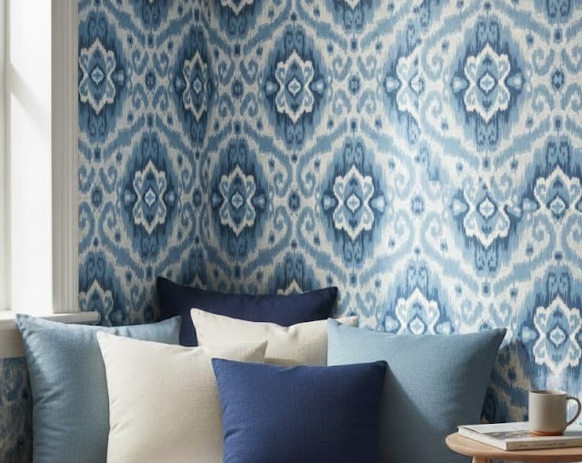 Wallpaper choice #2: Subtle Ikat or Mediterranean - Tile Patterns Ikat patterns or wallpaper that evokes hand-painted Mediterranean tiles in soft blues, warm whites, and natural terracotta bring pattern without overwhelming the serene Mediterranean vibe.These patterns add just enough visual interest to keep your space from feeling flat while maintaining that effortless, breezy quality. You'll feel transported to coastal villages where life moves slower. The soft blues evoke the sea and sky, creating feelings of tranquility and openness. This wallpaper choice helps you cultivate a home that feels like a perpetual retreat ; calming, restorative, and deeply comforting.